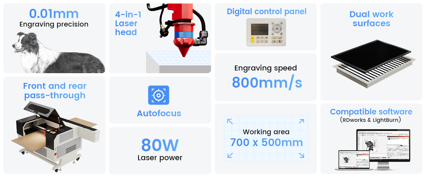 Monport 80W CO2 laser engraver is compatible with Windows and Mac, supporting RDWorks and LightBurn. Whether for DIY or commercial use, users can attain precise control and engravings on various nonmetallic surfaces, such as wood, glass, acrylic, leather, with a depth of 0.59'' and speeds up to 800mm/s.