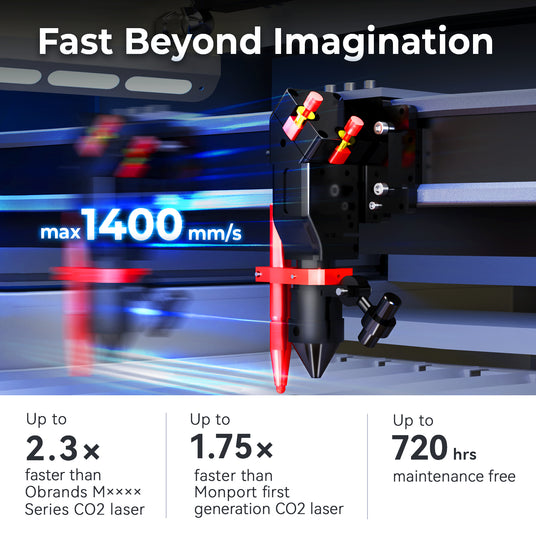Monport Effi10s 100W CO2 laser engraving machine has once again undergone a comprehensive upgrade to its series of products, with a speed increase of 75% compared to the previous generation, reaching a stable 1400mm/s (55.1 ips) at the fastest.(The world's fastest CO2 engraver for glass tubes)The brand new enclosed mechanical mechanism design eliminates the need for frequent maintenance of the machine.Everything is for a better user experience.