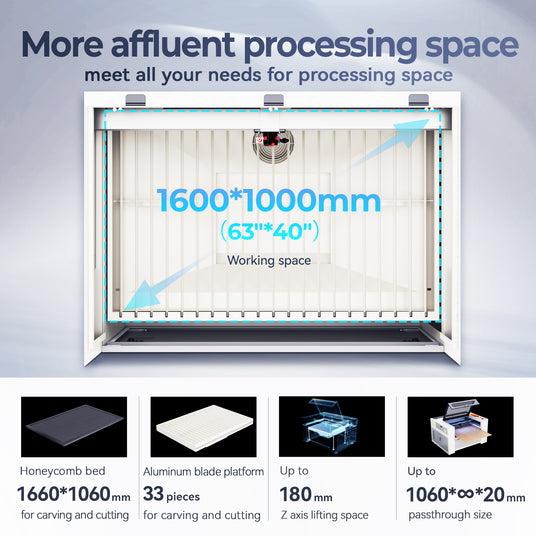 Monport provides a large processing space, with a working area of up to 1600 * 1000mm, and is equipped with a honeycomb bed and blade platforms; At the same time, the platform has a maximum lifting range of 180mm, and of course, front and rear passthrough is essential, allowing for the placement of materials up to 20mm thick; Finally, for circular objects, they can also be carved with a rotating axis. The waste will be collected in drawers for easy cleaning.