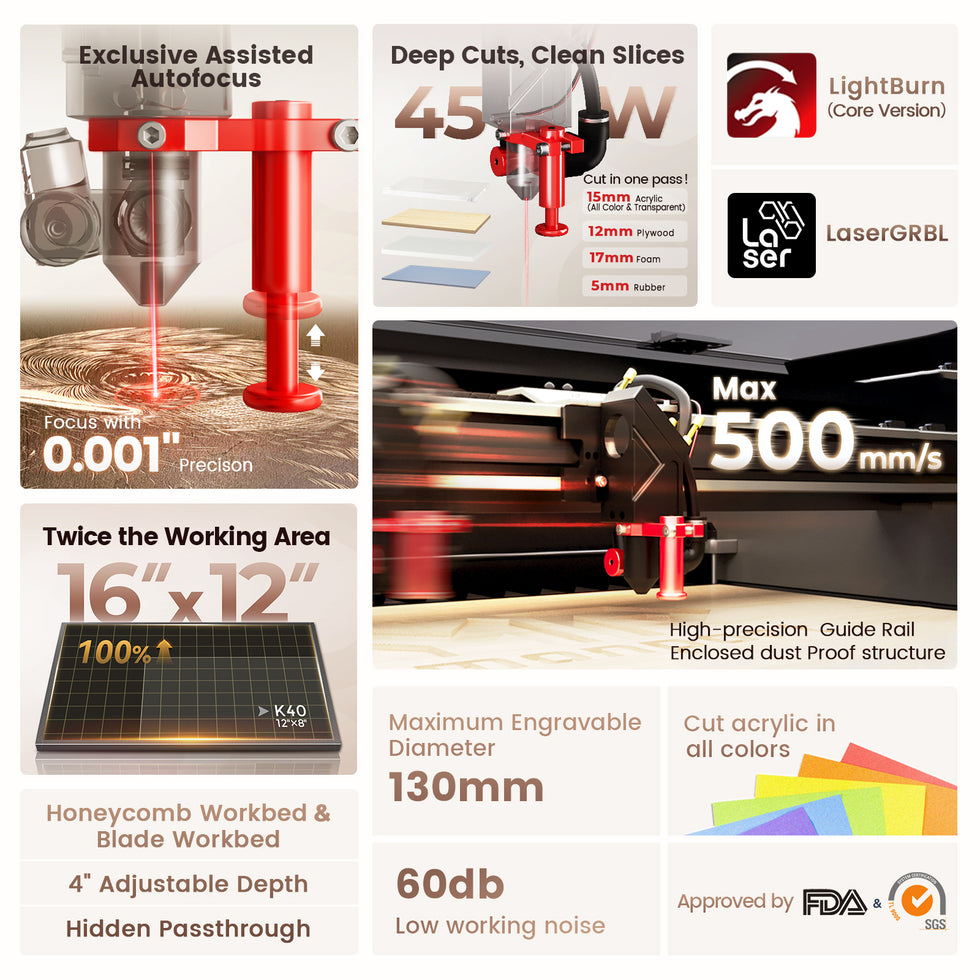 Featuringexcellent noise control, this laser operates with minimal sound, making it ideal for home or office use. Theprecise red light indicationallows for accurate alignment of your projects, enhancing precision during engraving and cutting. Equipped with asilent assist air system, exhaust system, and water pump, it efficiently removes smoke and debris without generating excess noise, contributing to a peaceful workspace.