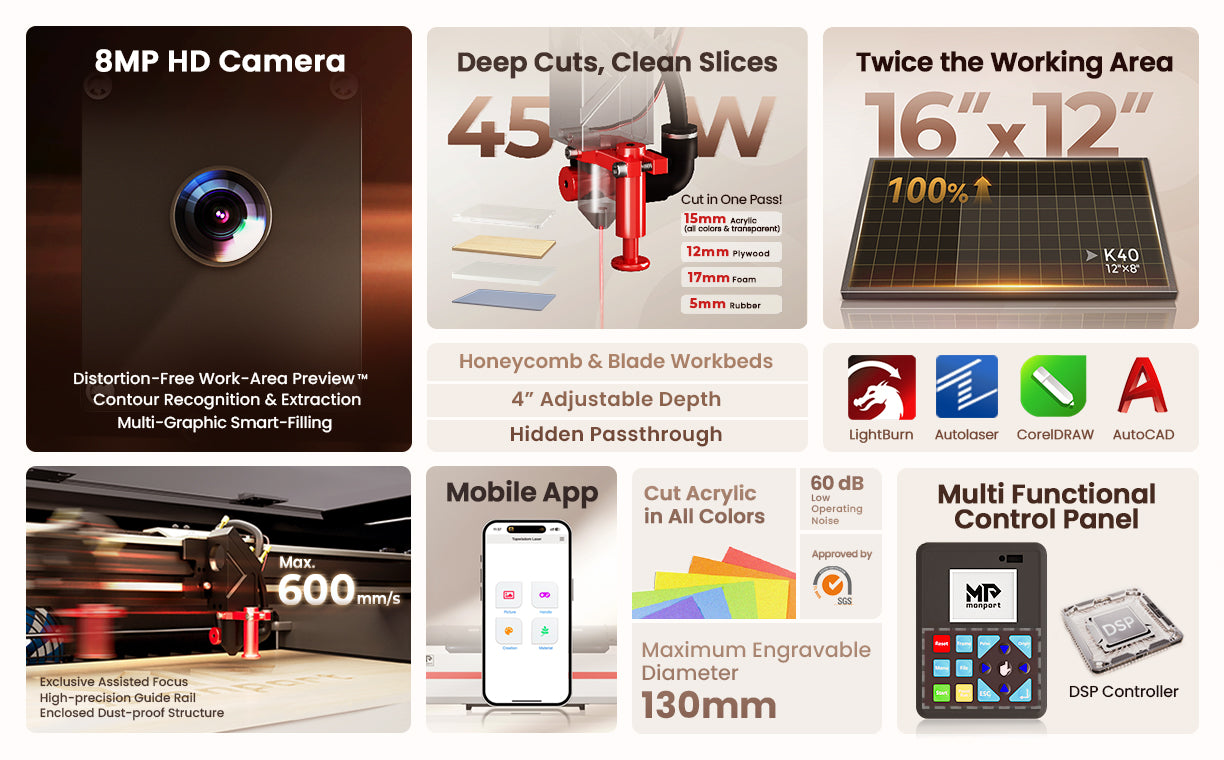 Thanks to Monport’s control panel with LCD display and computer interface, the Reno45 Pro Vision is one of the easiest desktop lasers to operate. It comes with user-friendly and feature-rich Autolaser software, allowing you to get started quickly, even if you have never used an engraving machine before. The Reno45 Pro Vision is also fully compatible with LightBurn* and supports USB 2.0 connectivity. You can even operate the Reno45 Pro Vision through our mobile app -- Topwisdom.