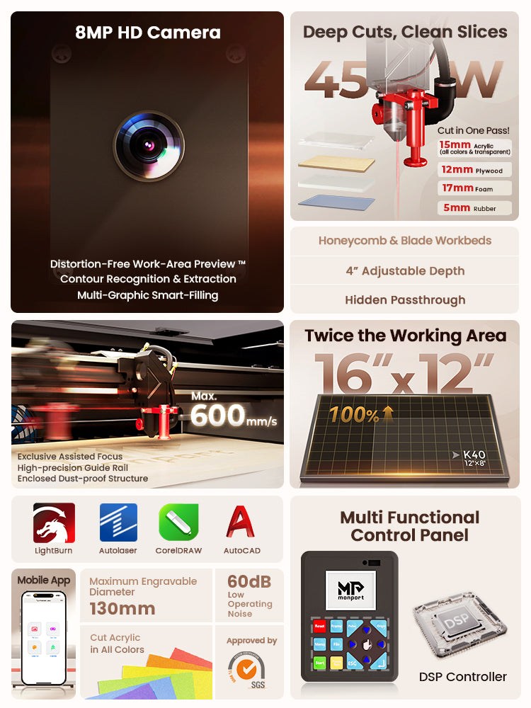 With Monport Reno’s 8MP camera, enjoy distortion-free work-area previews and precise,high-definition detail from the panoramic camera, enabling quick, precise positioning, reducing your valuable time.