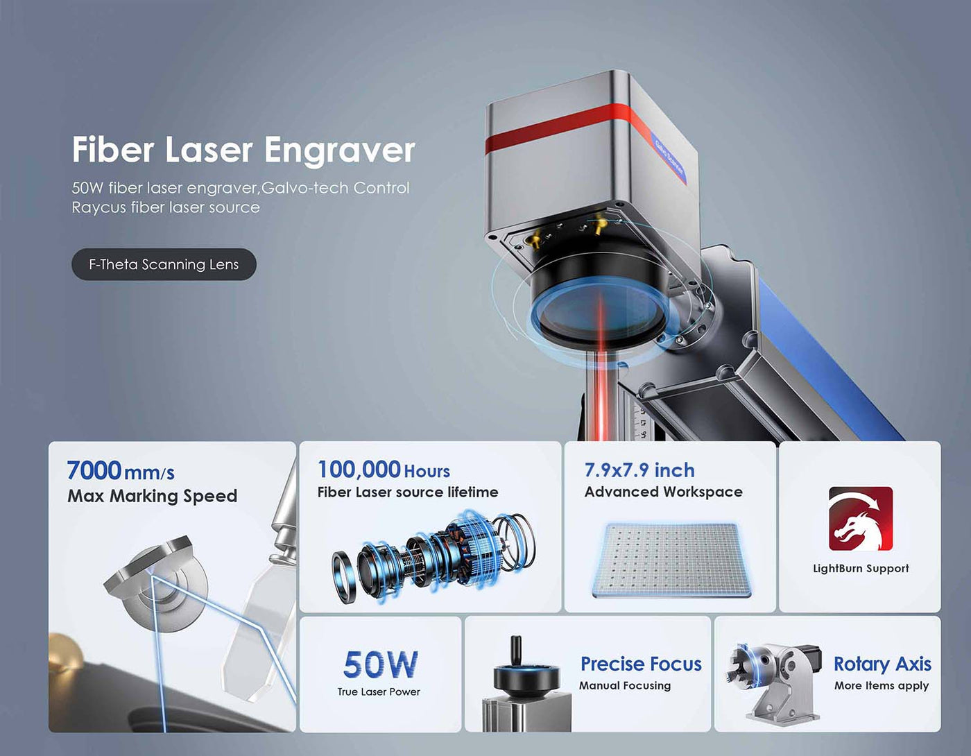 By rotating the focus-height wheel, you can quickly focus the galvanometer laser on various materials like gold, silver, brass, stainless steel, etc . Plus, the vertical supporting tower is equipped with a ruler for convenient focus height measurements.