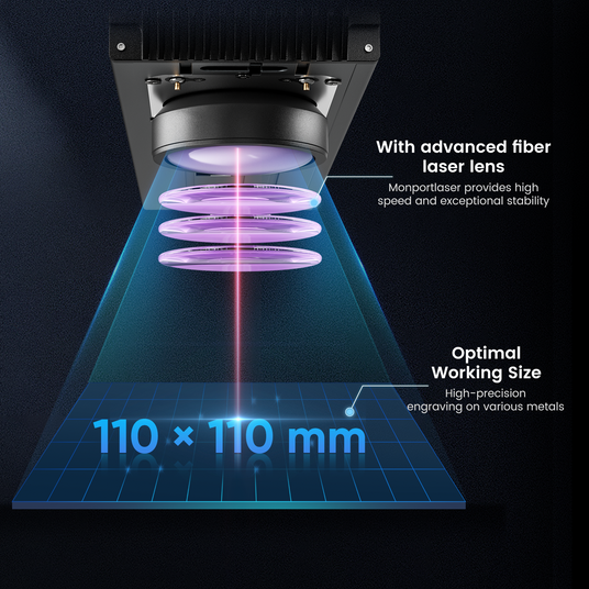 The Monport GA fiber laser marking machine features a working size of 110x110 mm (4.3x4.3 inches), making it ideal for precise marking and engraving. This size allows for optimal marking results on various materials, including metals like stainless steel and aluminum.