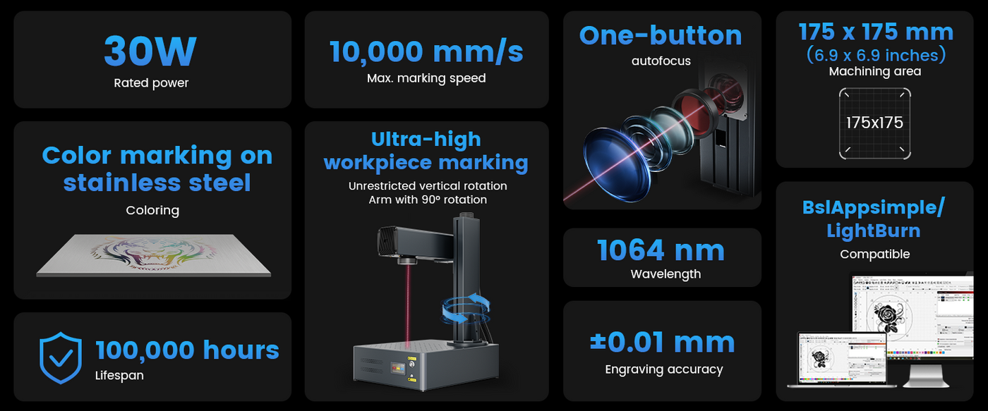 Installing this LightBurn compatible fiber laser marker is a breeze with its excellent foldable vertical arm design —just tighten two screws, and you're ready to go. Monport promises that even beginners can complete the setup within a minute after unboxing for a hassle-free experience.
