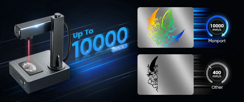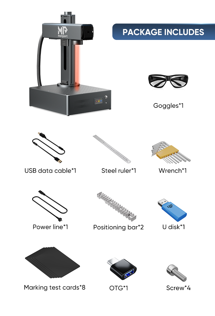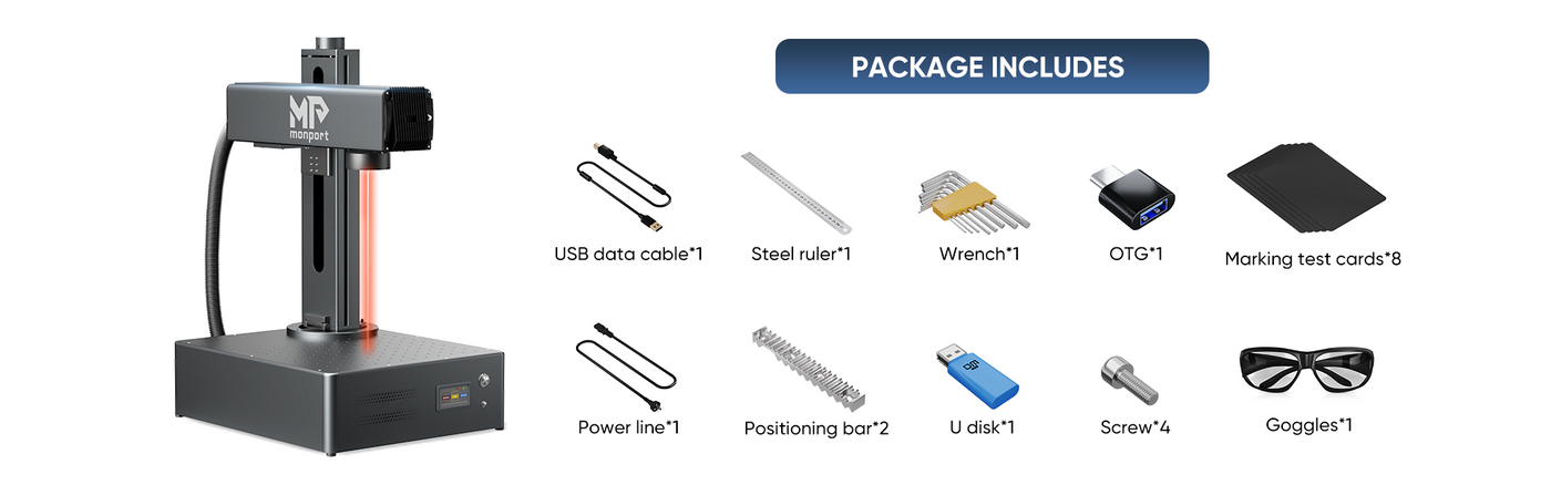 The Monport GA fiber laser is equipped with a powerful 50W driver and 50W laser source, enabling precise marking and engraving on stainless steel, aluminum, and other metals, all while maintaining sub-micron accuracy and zero-error precision.