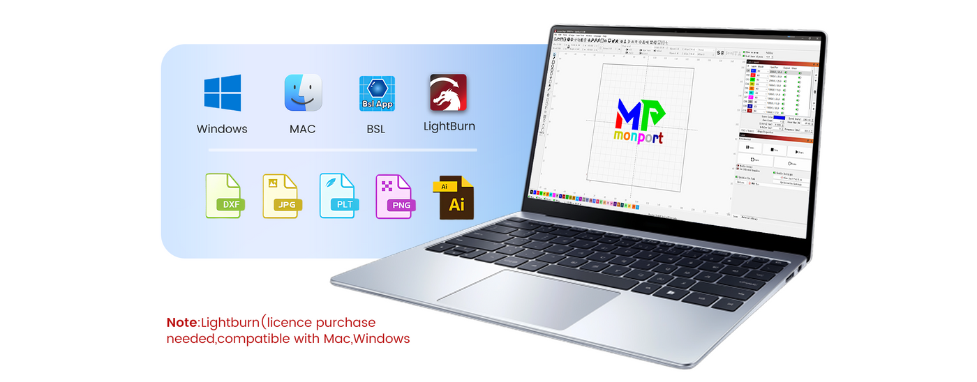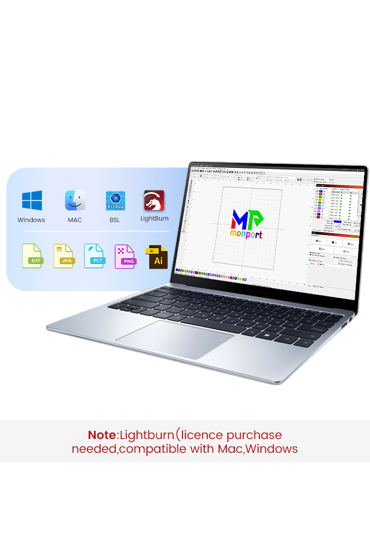 LightBurn software allows you to edit and arrange your designs. This powerful marking and cutting control software is designed for laser and CNC applications and supports a variety of file formats. Its intuitive interface and extensive features enable you to easily create and customize designs for precise marking and cutting.