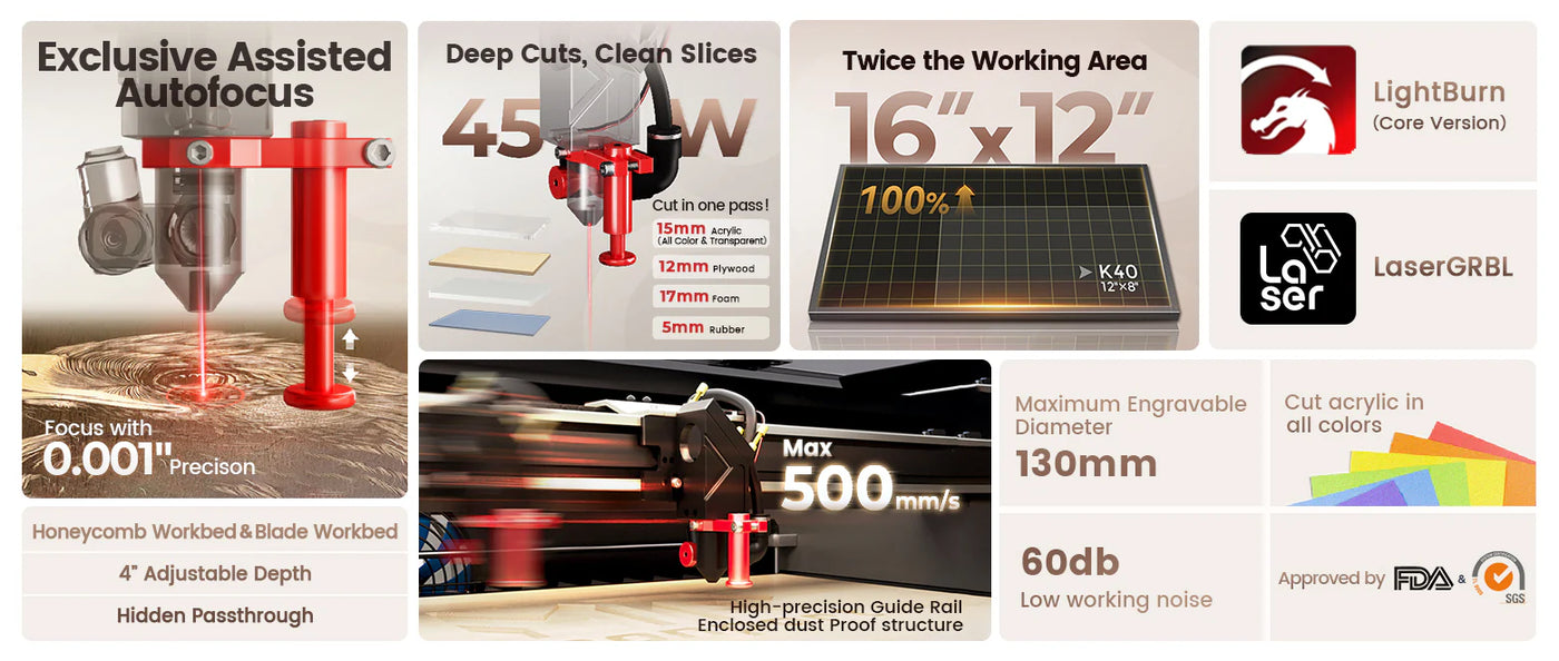 Featuringexcellent noise control, this laser operates with minimal sound, making it ideal for home or office use. Theprecise red light indicationallows for accurate alignment of your projects, enhancing precision during engraving and cutting. Equipped with asilent assist air system, exhaust system, and water pump, it efficiently removes smoke and debris without generating excess noise, contributing to a peaceful workspace.